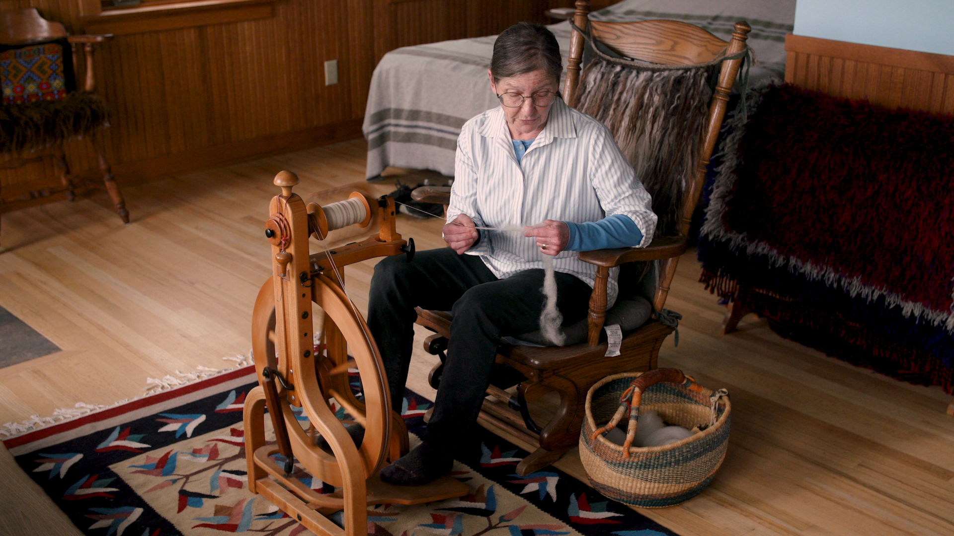 Laura Demuth is an expert weaver on a farm with her husband, Steve, and together they raise their own sheep. Laura spins the harvested wool to use for all of her textile needs from making blankets to weaving tapestries.