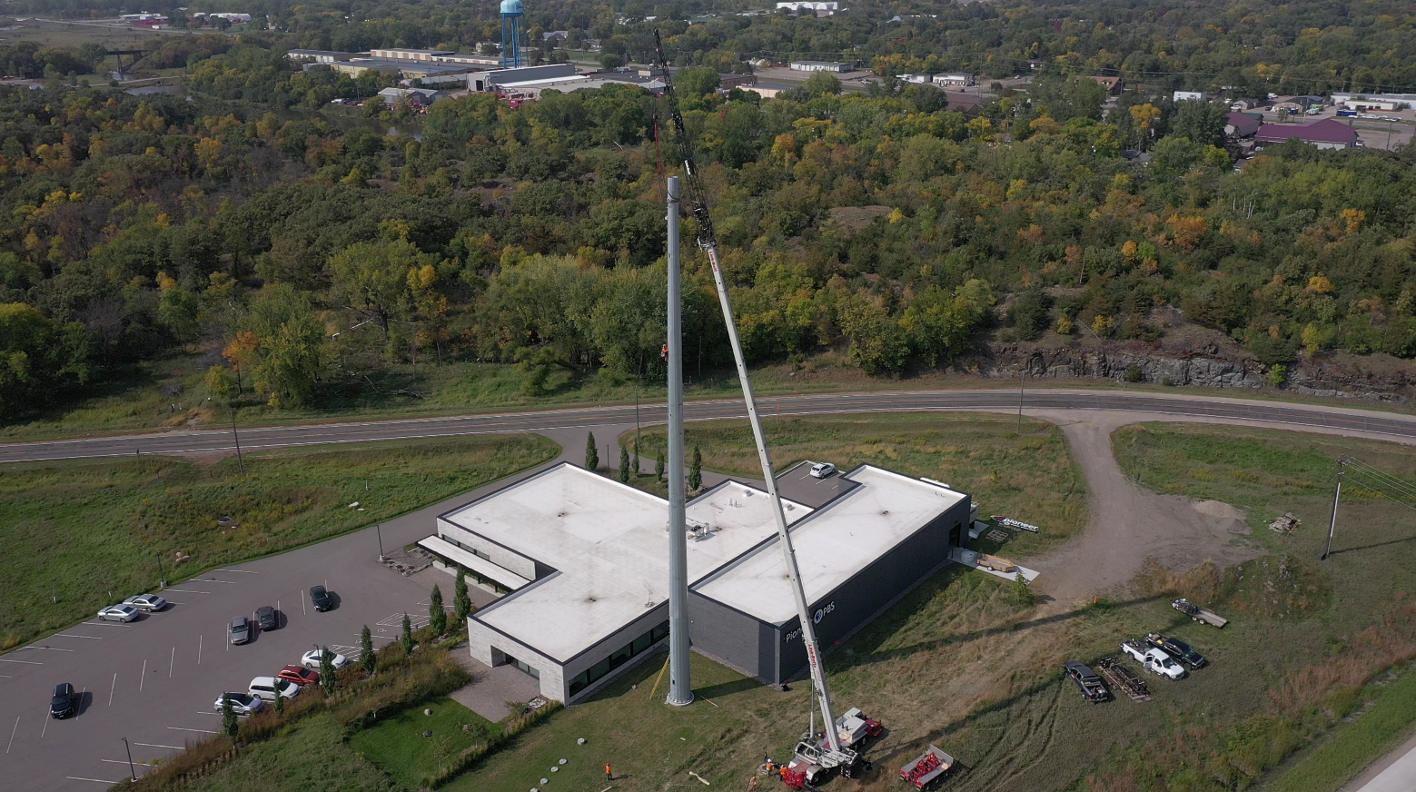 A major milestone toward completing the transition of moving the Pioneer PBS master control operation from Appleton to Granite Falls was accomplished this past week with the erection of two new towers -- one near Watson and one next to the new studio in Granite Falls. These towers will allow Pioneer PBS studios in Granite Falls to have a microwave link to the 1200-foot head end tower in Appleton, enabling the remaining staff to relocate and new master control equipment to be installed in Granite Falls.