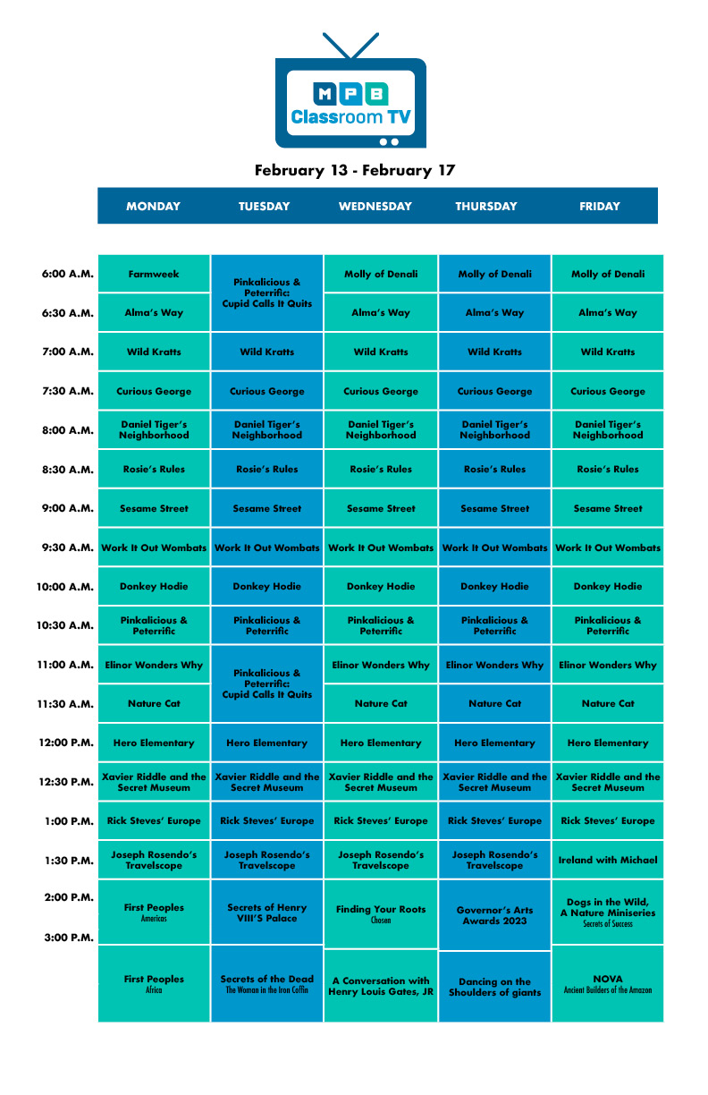 MPB Television programming on our main channel will change from 8 a.m. to 4 p.m. Monday through Friday to educational content for PreK-12 students.
