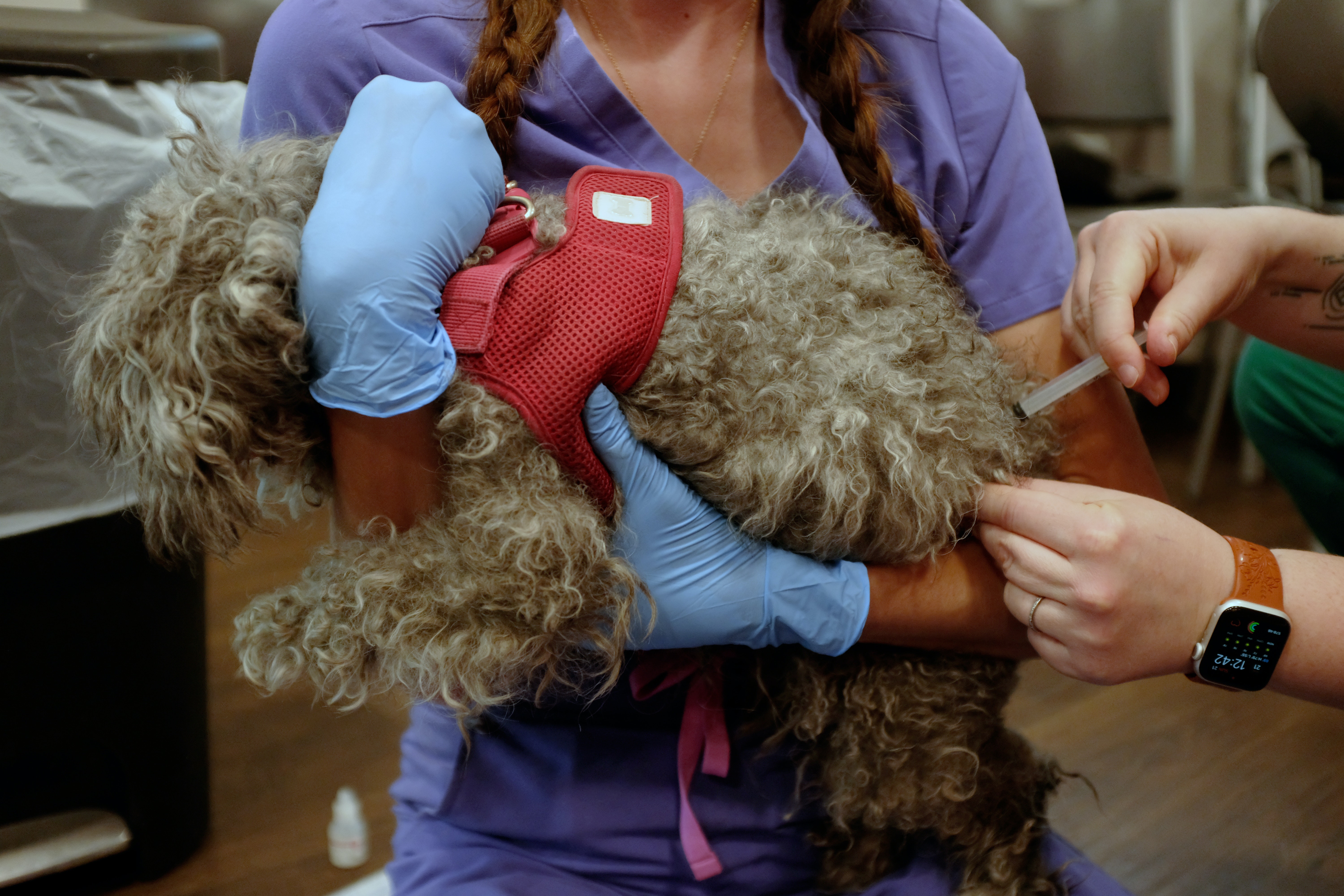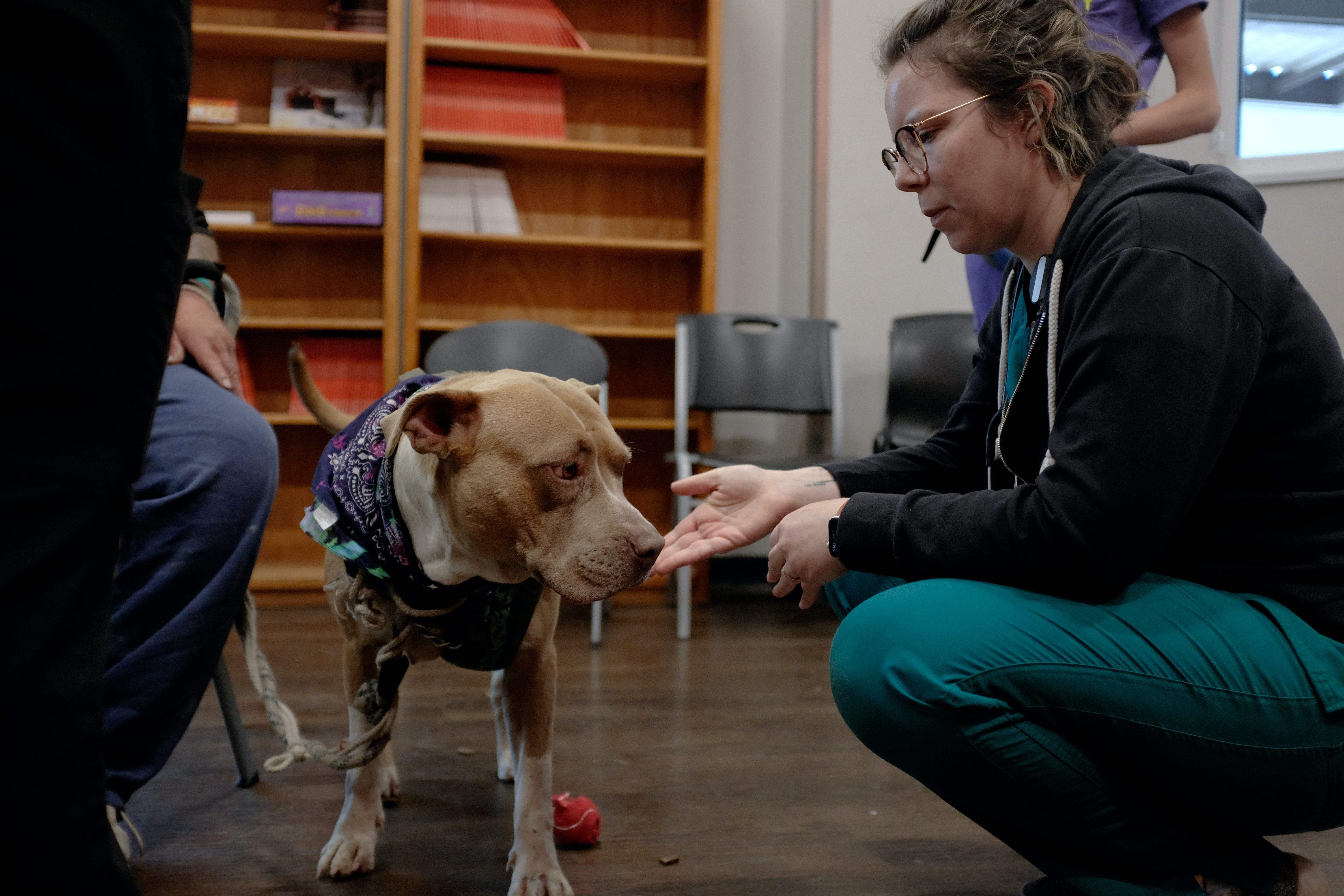 Dr. Taylor DeWitt volunteers with Street Dog Coalition to provide free veterinary care for dogs at the Springs Rescue Mission. (Zach Ben-Atmos/Rocky Mountain PBS)