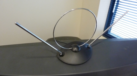 Common loop and rabbit ear antenna. This is a low cost no gain antenna that may work well for some channels and not at all for other channels. Positioning the antenna near a window that is in the direction of the television broadcast antennas and high in the room may help with reception issues.